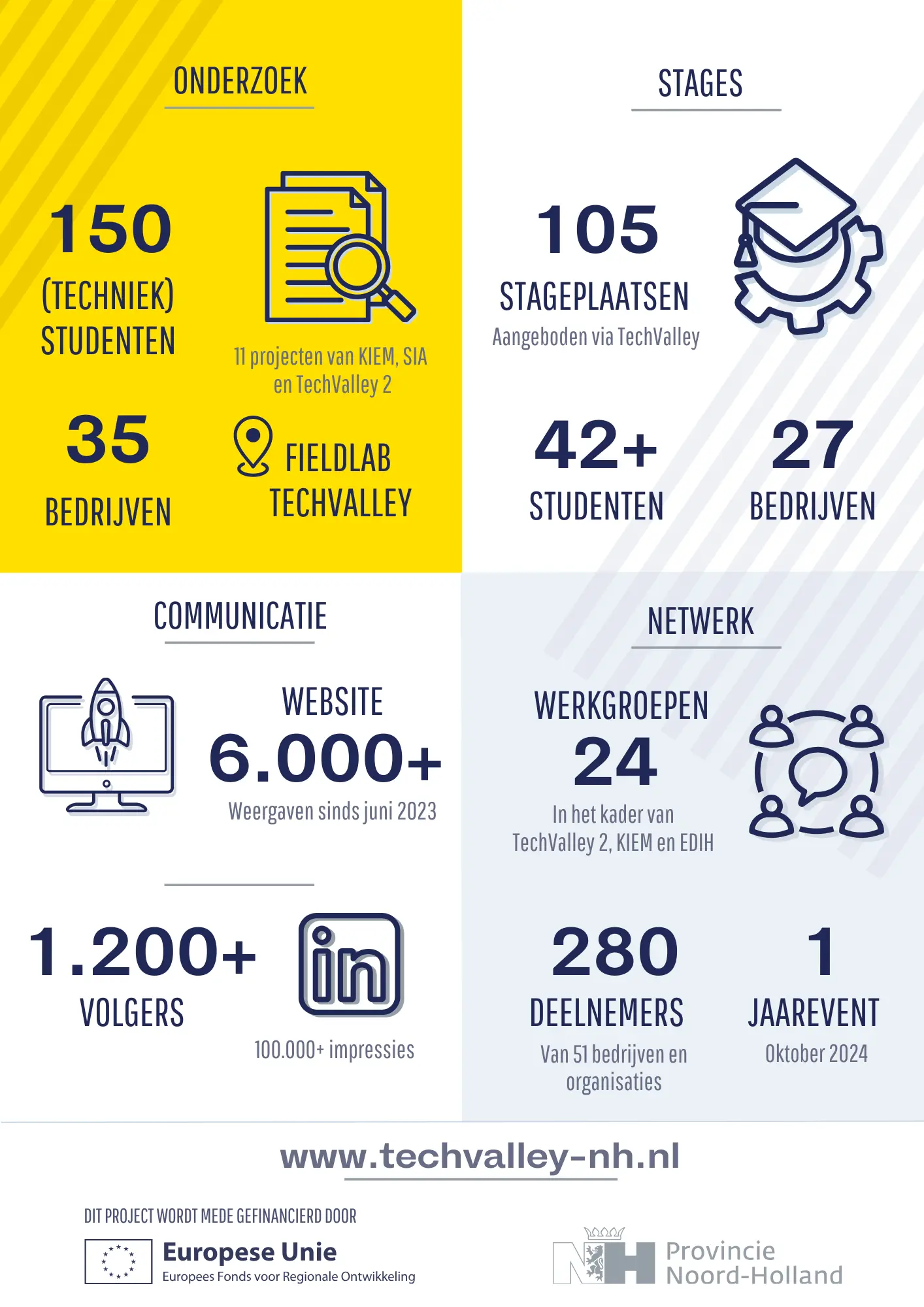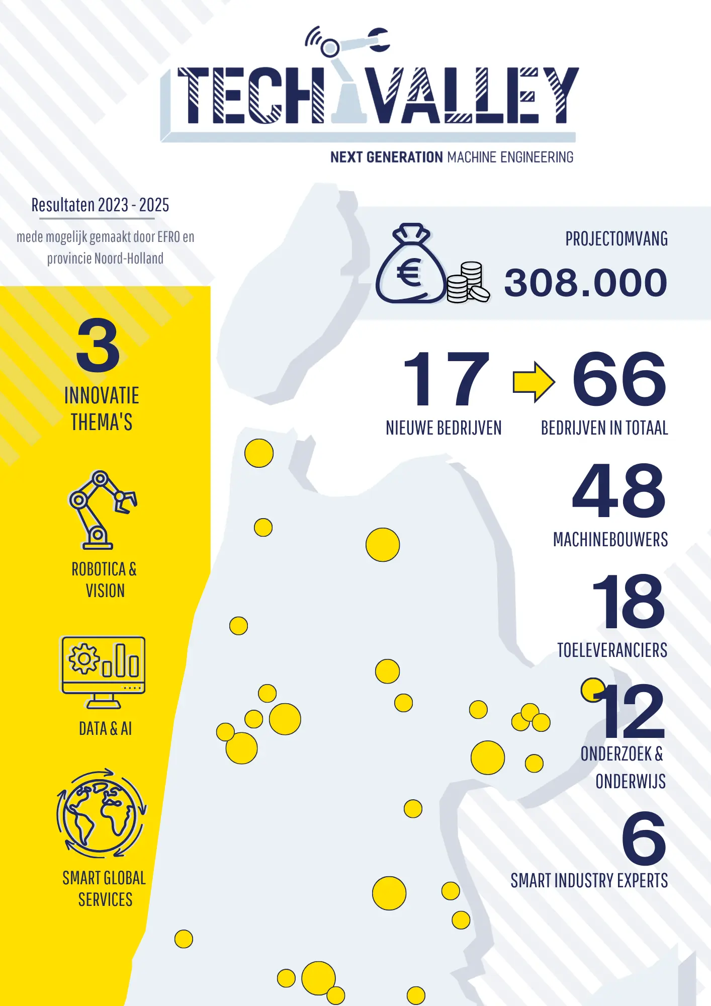 Met steun van het Europees Fonds voor Regionale Ontwikkeling (EFRO) is TechValley in de afgelopen twee jaar verder uitgegroeid tot hét regionale innovatie-ecosysteem voor de maakindustrie in Noord-Holland. TechValley bestaat uit een actief netwerk van inmiddels 66 bedrijven, 11 onderwijsinstellingen en 12 andere stakeholders, waaronder partners zoals Koninklijke metaalunie, FME, Ontwikkelingsbedrijf NHN, Hogeschool Inholland, Hogeschool van Amsterdam, Tetrix Techniekopleidingen, Universiteit van Amsterdam, Universiteit Twente en internationale instituten zoals het Duitse Fraunhofer instituut.